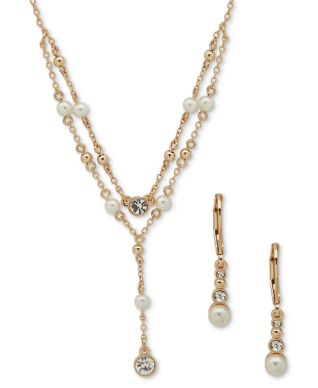 Anne Klein Gold-Tone Mixed Crystal Lariat Necklace & Drop Earrings Set